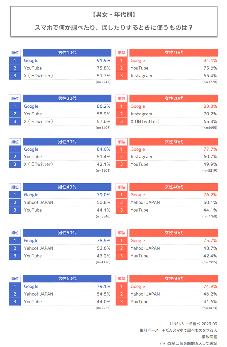2.スマホでの調べものは「Google」の利用が圧倒的。女性20~30代は「Instagram」が2位