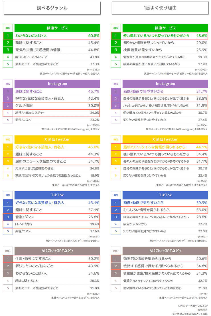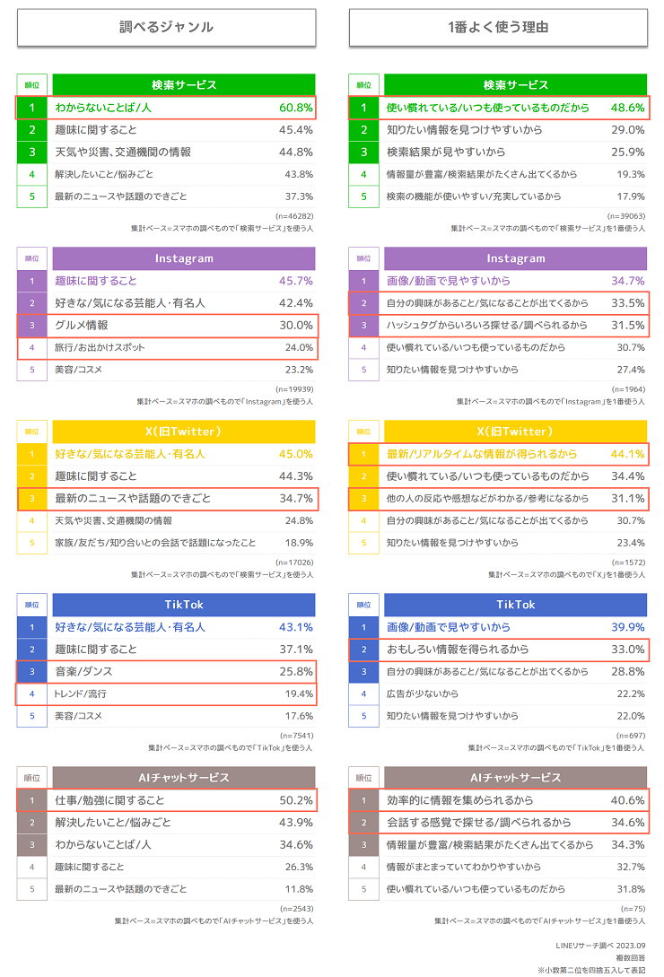 「検索サービス※1」「X(旧Twitter)」「Instagram」「TikTok」「AIチャットサービス※2」をピックアップして、それぞれ見ていきましょう。