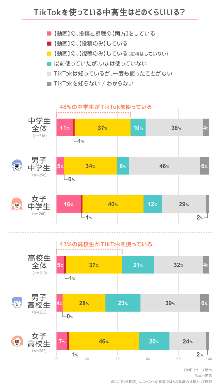 1.中学生は48%、高校生は43%がTikTokを使っている