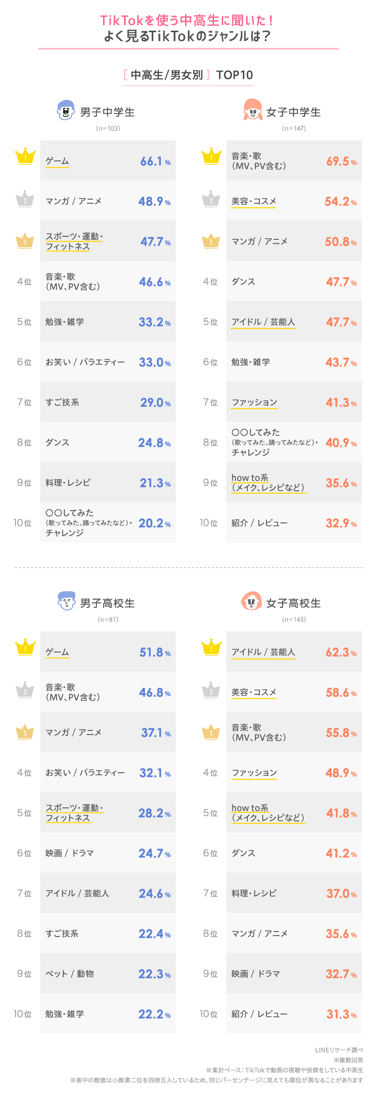一方、女子高校生は「アイドル / 芸能人」が6割超でTOPに。2位以降に入った「美容・コスメ」「ファッション」「how to系(メイク、レシピなど)」なども、女子のほうが高い割合となりました。