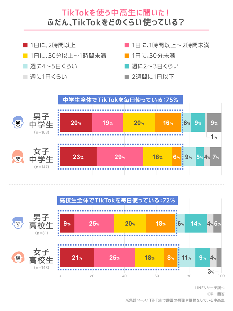 1.中学生は48%、高校生は43%がTikTokを使っている2.TikTokを使っている中高生のうち、毎日使っている中学生は75%、高校生は72%