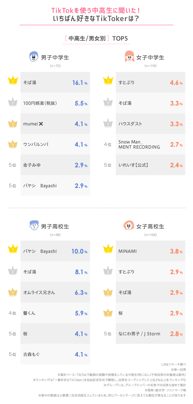 特徴のある声で学校ネタなどのコントを投稿している「そば湯」は、中高生ともに男女別ランキングでTOP3に入っており、昨年の調査では男子高校生でTOP、女子高校生で4位にランクインしていました。