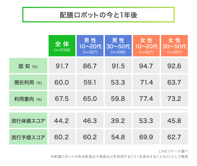 「配膳ロボット」の流行予想スコアは全体で「60.2」で、およそ2人に1人が1年後に利用していそうというイメージ。現在の流行体感から比較すると、1年後には今の1.4倍浸透しているというイメージになります。