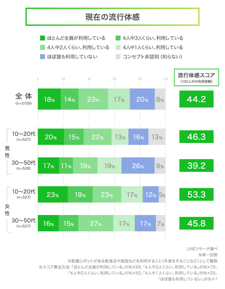 その結果「配膳ロボット」の流行体感スコアは全体で「44.2」で、およそ2~3人に1人が利用しているイメージを持たれていることがわかります。