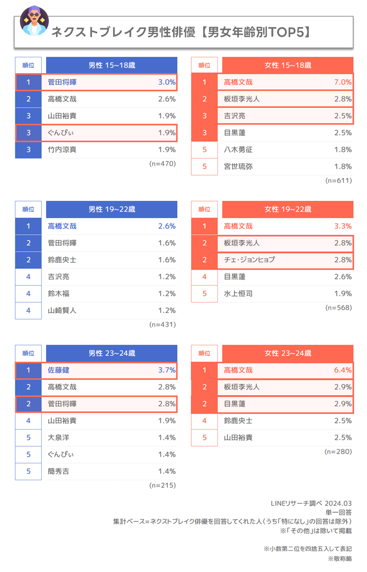 1. 総合ランキング、男性俳優は「高橋文哉」、女性俳優は「出口夏希」がTOP2. ネクストブレイク男性俳優の男女年齢別傾向は?