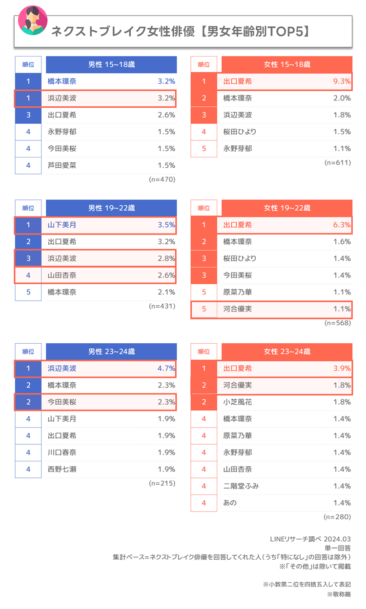 男性ではすべての年齢層で「浜辺美波」がTOP3に入り、男性15~18歳では「橋本環奈」と同率で1位、男性23~24歳では1位でした。浜辺美波主演のドラマ、本格謎解きミステリー『アリバイ崩し承りますスペシャル』も4年ぶりに一夜限りで復活し放送されました。男性19~22歳では、「山下美月」と「出口夏希」が同率1位でした。乃木坂46のメンバーであり、CanCamの専属モデルやドラマなどマルチに活躍している「山下美月」や映画『ゴールデンカムイ』のアシリパ役を演じた「山田杏奈」は、ほかの年齢層に比べて話題となっていました。