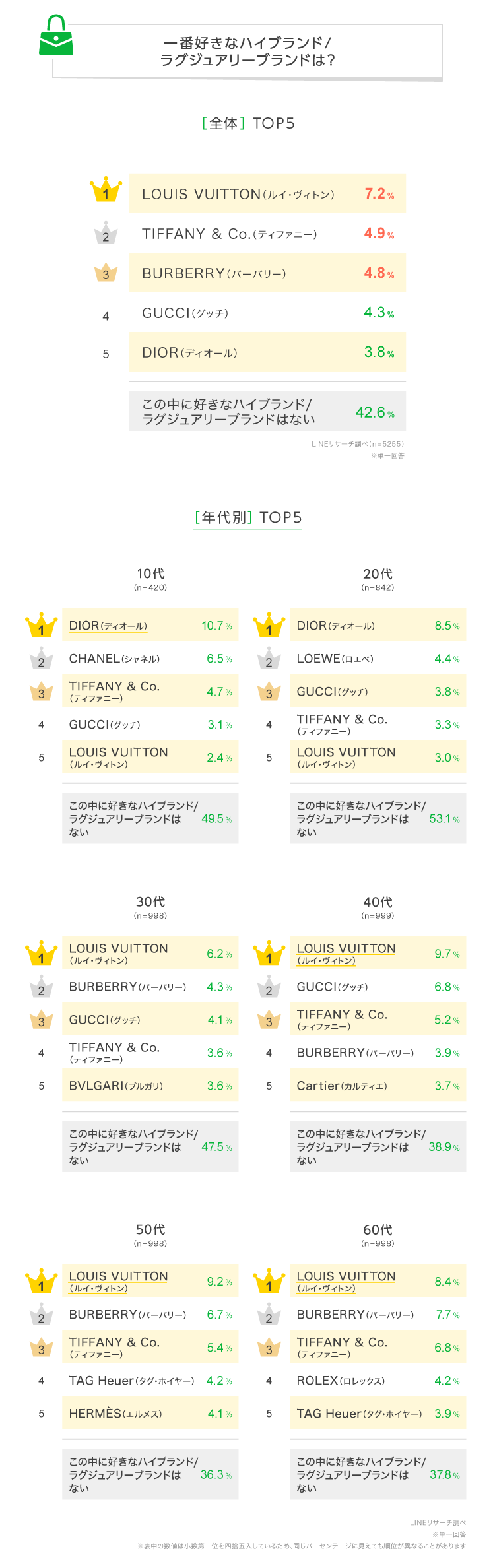 全体の1位は「LOUIS VUITTON(ルイ・ヴィトン)」。2位以降は「TIFFANY & Co.(ティファニー)」「BURBERRY(バーバリー)」「GUCCI(グッチ)」「DIOR(ディオール)」が続きます。