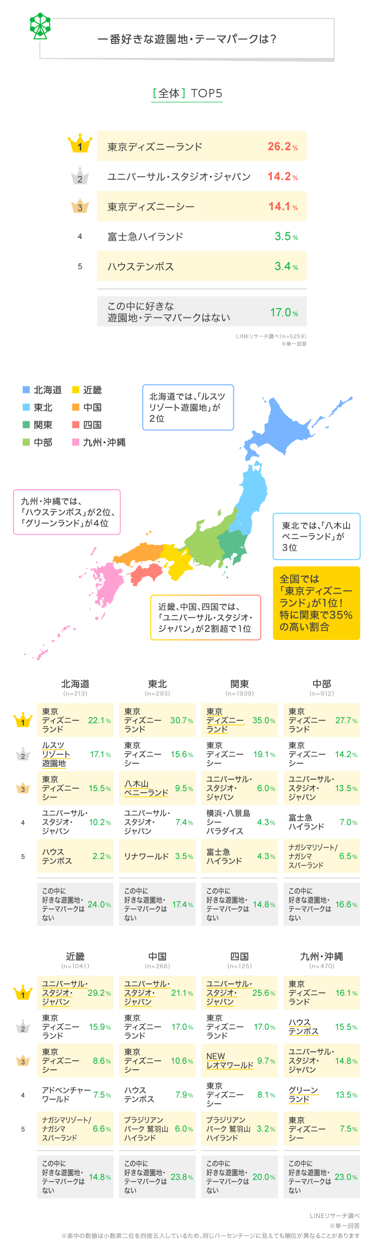 1.「東京ディズニーランド」が全国1位に。関東エリアでは、35%の高い割合2.一番好きな遊園地・テーマパークTOP3の好きな理由を紹介!