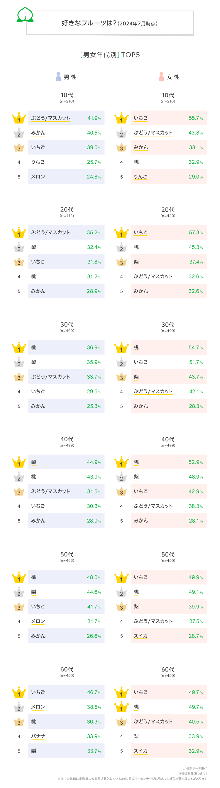2.好きなフルーツは男女年代別で差がみられる!