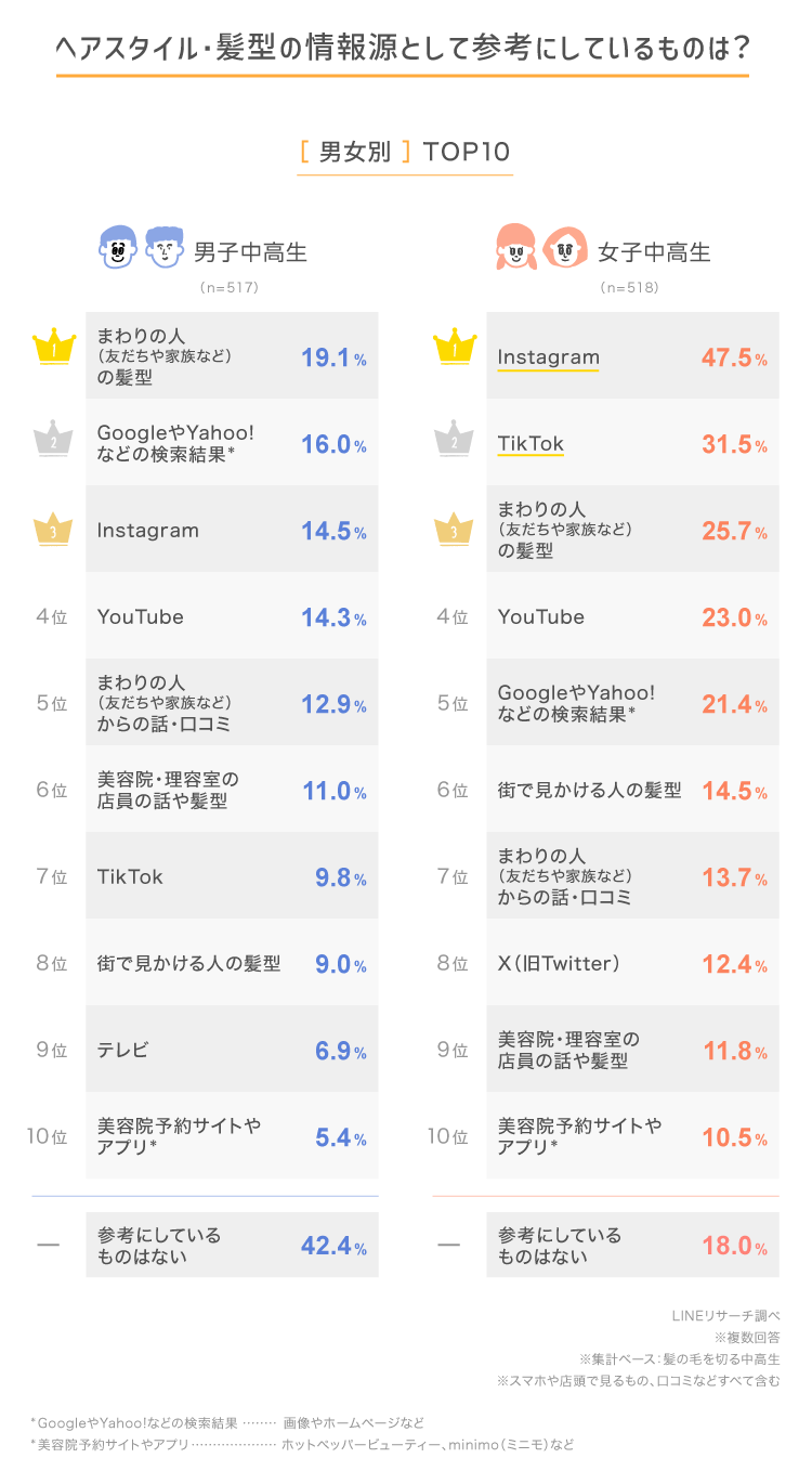 中高生に、ヘアスタイル・髪型の情報源としてふだん参考にしているものを聞きました。