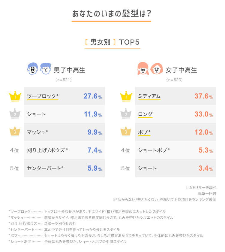 1.中高生のいまの髪型、男子1位は「ツーブロック」、女子は「ミディアム」「ロング」がTOP2