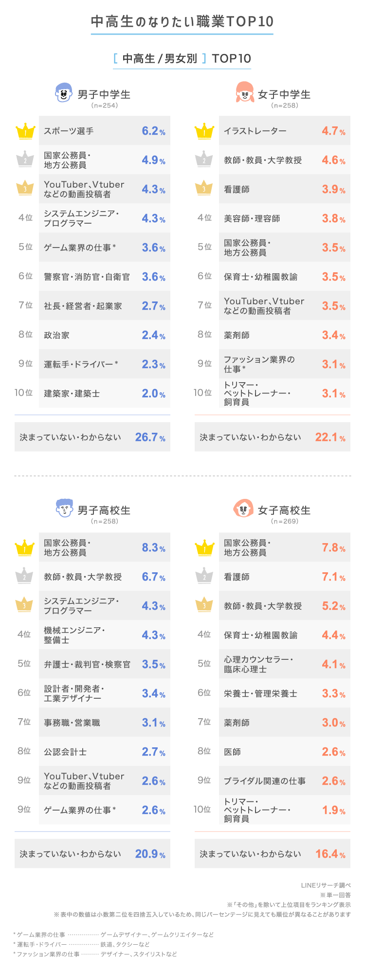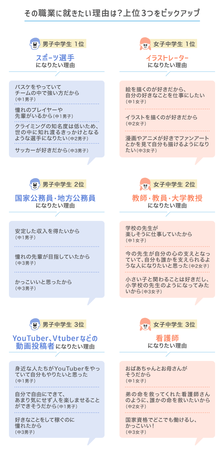 そのほかにも、「決まっていない・わからない」と回答した割合は高校生よりも中学生のほうが高く、特に男子中学生では2割台後半と高めです。また、中学生の男女で1位だった「スポーツ選手」と「イラストレーター」は、高校生ではランキング外に。年齢とともに考え方や興味・関心も変わっていくようです。