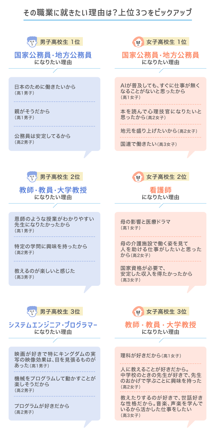 高校生のなりたい職業TOP3に就きたい理由では、中学生と同様に家族や恩師からの影響のほか国や地域のために仕事をしたい、自分の得意分野を活かしたいといった声や、安定を求めるような声もみられました。