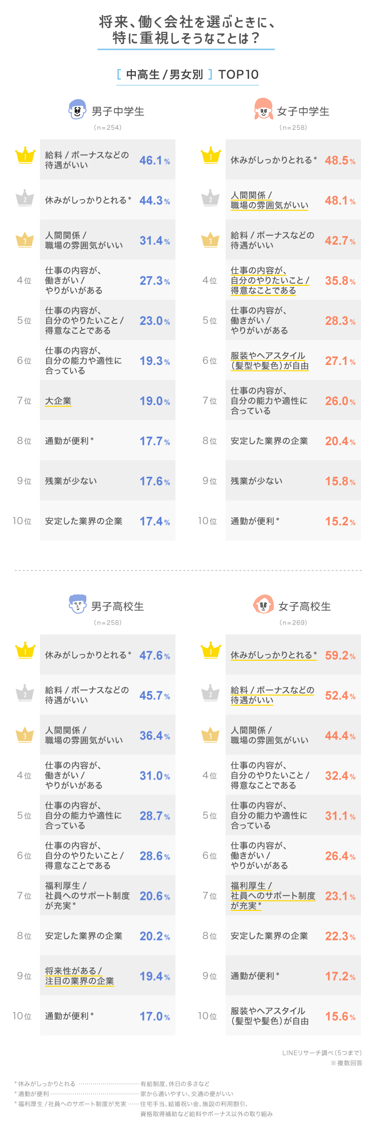 全体のTOP2は「休みがしっかりとれる」「給料/ボーナスなどの待遇がいい」で、4割台後半から5割の高い割合です。また、順位に違いはあるものの、中高生の男女すべてにおいて、「休みがしっかりとれる」「給料/ボーナスなどの待遇がいい」「人間関係/職場の雰囲気がいい」がTOP3に入りました。