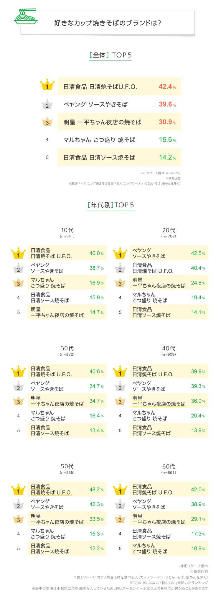 また、全体3位の「明星 一平ちゃん夜店の焼そば」は30~50代で3割台とやや高めの割合でした。