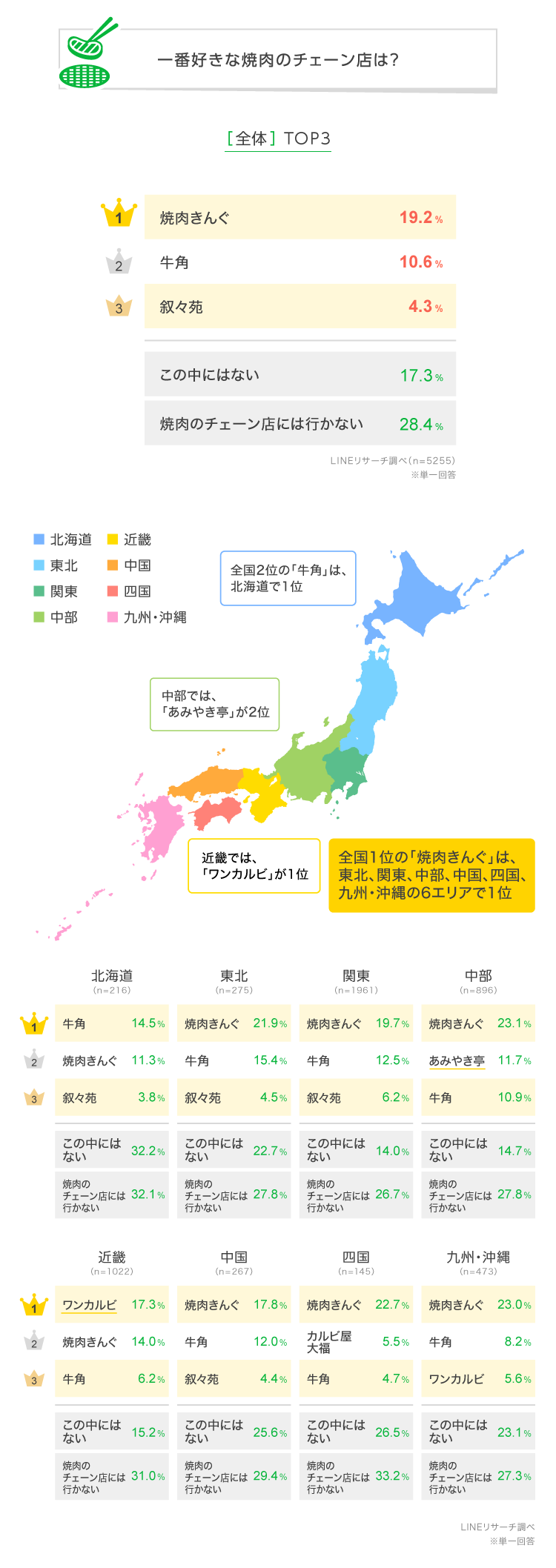 また、中部では「あみやき亭」が2位、四国では割合は高くないものの「カルビ屋 大福」が2位にランクインと地域による違いも見られました。