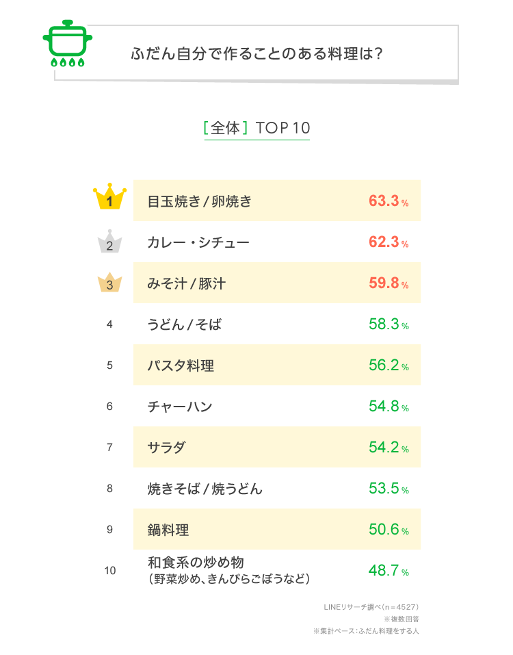 全体では「目玉焼き/卵焼き」「カレー・シチュー」が6割強でTOP2となりました。上位には「みそ汁/豚汁」「鍋料理」といった汁物系、「うどん/そば」「パスタ料理」「焼きそば/焼うどん」「チャーハン」などの麺・主食系、「サラダ」「和食系の炒め物(野菜炒め、きんぴらごぼうなど)」といった副菜まで幅広くランクインしており、和洋中さまざまなジャンルの料理が作られているようです。