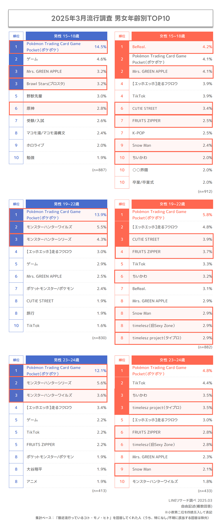 最後に、男女年齢別の結果をみてみましょう。総合1位の「Pokémon Trading Card Game Pocket(ポケポケ)」は、女性15~18歳を除くすべての年齢層で1位でした。特に男性を中心に流行している様子がわかります。女性15~18歳では1位「BeReal.」とほぼ同率の2位となり、話題が拮抗しています。