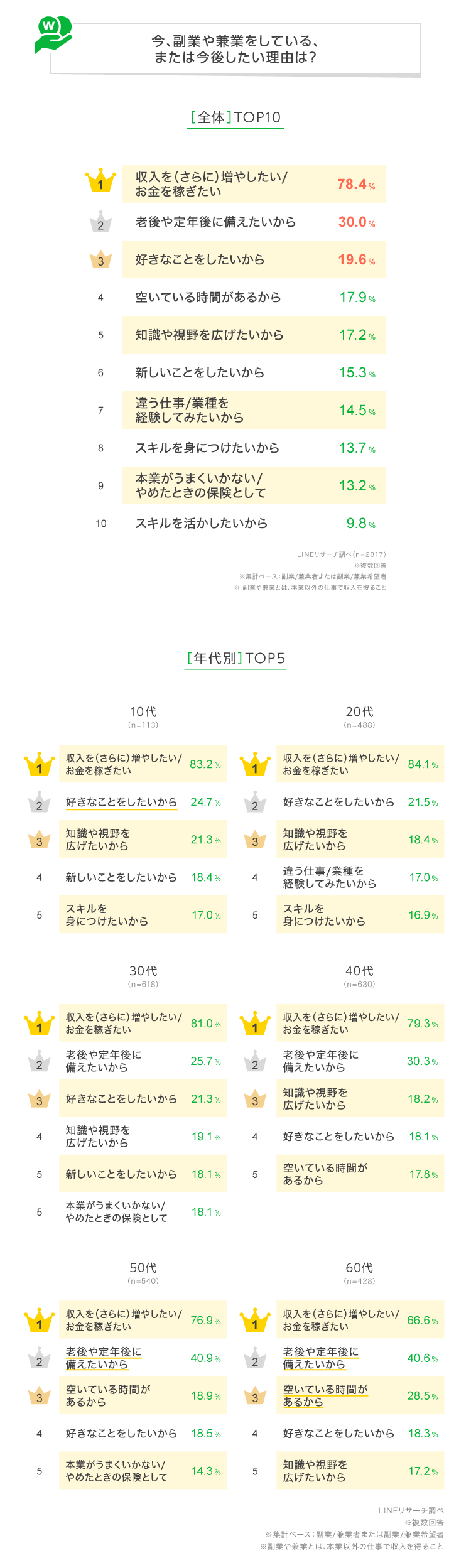 グラフにはありませんが、10~20代男性で「スキルを身につけたいから」、10代男性で「知識や視野を広げたいから」、10代女性で「新しいことをしたいから」の割合が高めとなっており、若い年代で、副業や兼業を通して、学びや経験を重視している傾向がみられました。