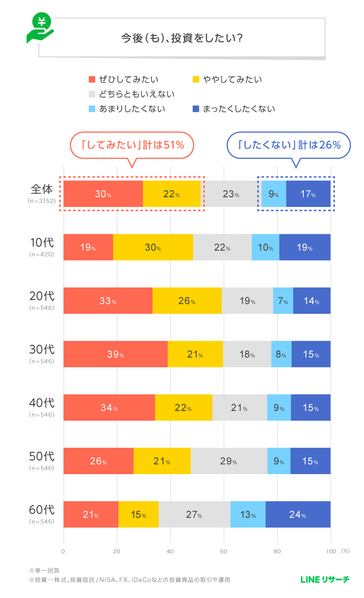 一方で、「あまりしたくない」「まったくしたくない」を合わせた【したくない】計は2割台半ばに留まり、多くの人は投資に対して前向きな考えを持っている様子がうかがえます。