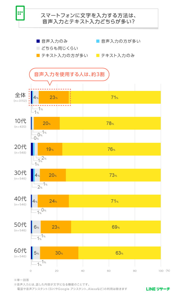一方、「音声入力のみ」「音声入力の方が多い」「どちらも同じくらい」「テキスト入力の方が多い」を合わせた、【音声入力を使用する人】は約3割いることがわかりました。