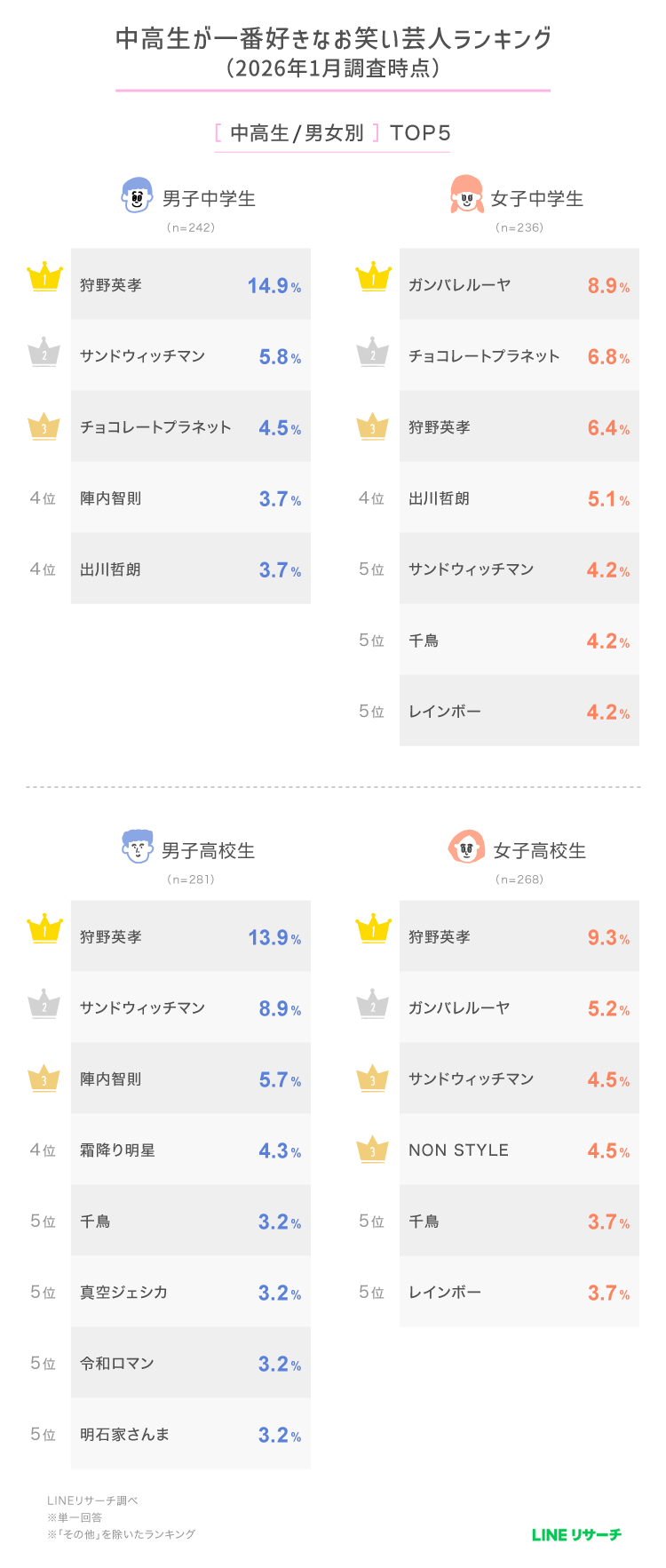 男子高校生では、2位「サンドウィッチマン」、3位「陣内智則」となり、女子高校生では2位に「ガンバレルーヤ」、3位は同率で「サンドウィッチマン」「NON STYLE」がランクインしました。
